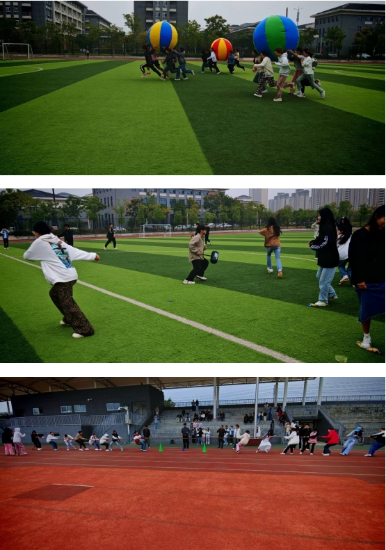 10月16日下午旅游与公共管理系在操场开展携“新”同行 “心”“新”相印—趣味团建活动。趣味运动会将竞技与娱乐相结合,注重学生的参与和交流。本次趣味运动趣味性十足,合作性强,依次进行了“拔河”“运转乾坤”“追逐尖叫鸡”三个项目,既考验个人的体能和技巧,又强调了团队协作的重要性。