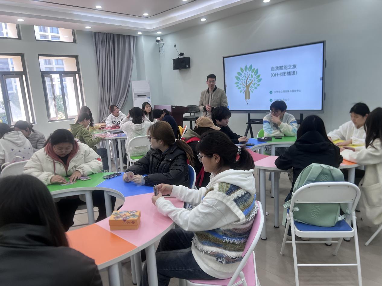 3月25日下午,一场生动有趣的OH卡牌团体心理辅导活动在我校大学生心理发展与服务中心顺利开展。此次团辅聚焦学生的自我成长需求,旨在通过OH卡牌这一独特工具,引导他们深入认识自我、理解自我,并在自我探索的旅途中汲取成长的力量。此次团辅由大学生心理发展与服务中心程耀辉老师主持,现场氛围热烈,同学们积极参与,共同开启了一段自我发现与成长的旅程。