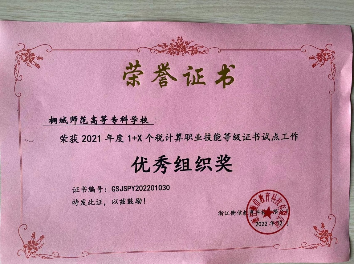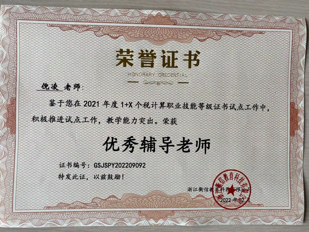在刚公布的“1+X”考证成绩中,我系2020级大数据与会计专业同学首次参加“1+X”个税计算职业技能等级证书(中级)考试,65人参加考试,65人全部通过,首考即完成了100%的通过率,成绩优异。学校获得主办单位浙江衡信教育科技有限公司颁发的优秀组织奖,并成功入选“1+X”个税计算职业技能等级证书试点工作全国十佳试点院校,我系倪凌老师获“优秀辅导教师”。