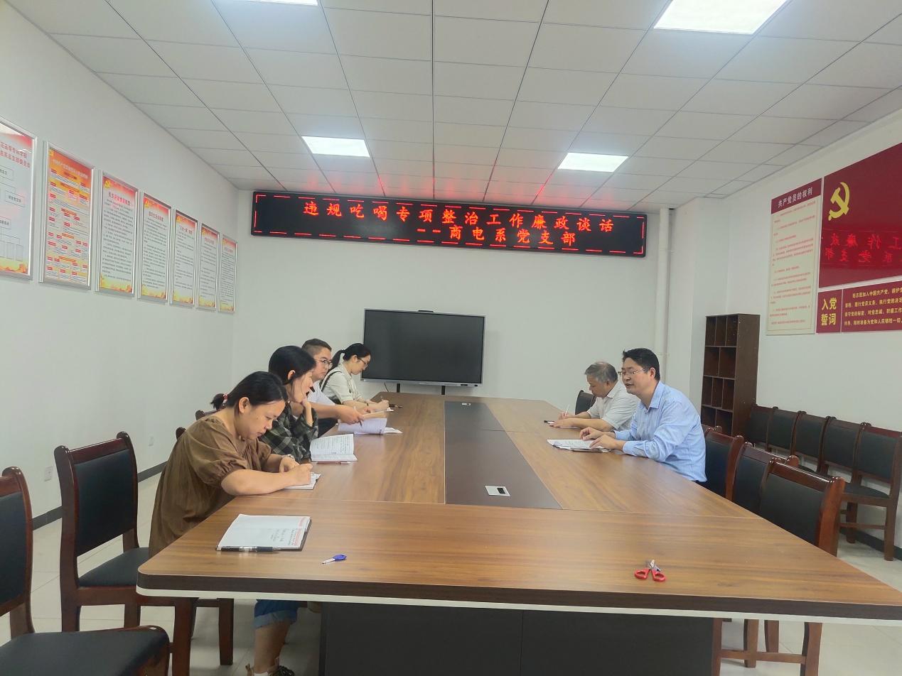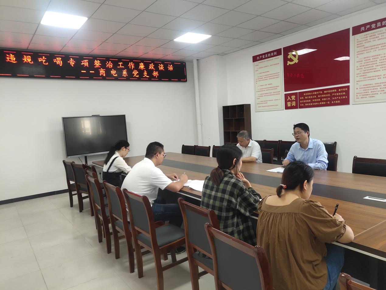 根据学校《违规吃喝问题专项整治行动工作方案》实施意见,校党委委员、组织部长、统战部长、组织人事处处长王宏伟深入商电系动员、部署落实相关工作并与班子成员开展廉政谈话,系党政班子全体成员参会。