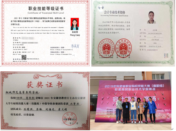 该专业教师团队是安徽省高水平教学团队。该专业一直是学校高职类专业的品牌,是最早试点教育部“1+X”证书制度的专业,在全国首次“1+X”个税计算(中级)考试中取得了100%的通过率,实现了X=3(即一个专业考取三门证书,另外两门为:金税财务信息、个税计算)的考证奇迹,跻身全省院校前列。该专业还有多名同学通过了初级会计师考试,多次获得国家、省级技能大赛奖项,如全国大学生财税技能大赛三等奖、安徽省大学生财税技能大赛二等奖等。