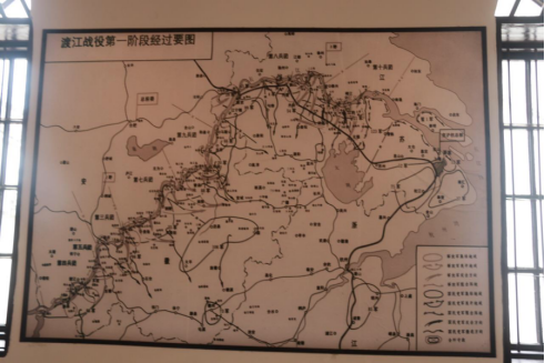 1949年4月14日,在渡江战役即将爆发的关键时刻,刘伯承、邓小平来到这里,召开师、地方地委级以上干部会议。邓小平在这次会议上传达了党的中共七届二中全会精神,他深刻阐述了如何在全国范围内取得胜利,如何巩固发展胜利成果。刘伯承号召部队用最大力量进行渡江作战的准备。他明确指出:不管是和是战,都要打过长江去,解放全中国。从这张地图可以看到渡江战役规模宏大,史无前例。正是人民解放军大无畏的革命精神取得了渡江战役的胜利。