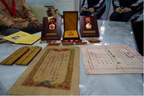 到达吴老家,映入眼帘的就是桌上的奖章和勋章。实践小组仔细观摩这些勋章,心灵都受到了非常大的震撼,对吴爷爷满是敬佩和崇拜。