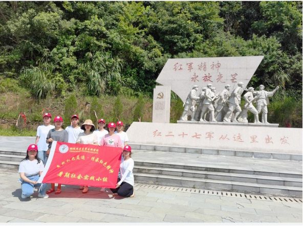 了解了红二十七军的诞生和发展后,实践小组团队前往红色文化广场。广场主题以雕塑为主,实际上是打造出了红旗造型,营造出了一种升腾的气氛,主要是雕塑了十位红军将土向着一个方向前进的样子,象征着革命理想振奋前行的中国共产党人的坚定信念和革命意志。