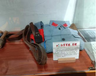 在队长的带领下,实践小组成员参观了罗汉尖革命根据地物品陈列馆,在这里可以看见革命战士们使用的木质保温饭盒、旧木瓢、梳妆台、武器,还有他们穿戴过的红军军服、军帽、草鞋等。
