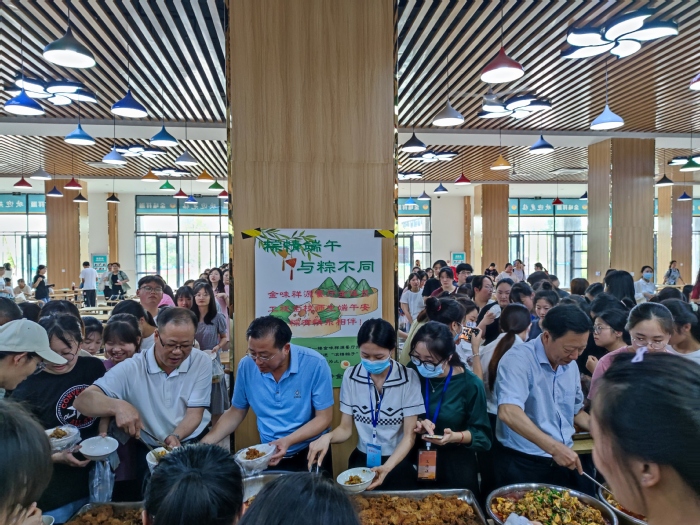 由于疫情影响,同学们不能回家过节,为了让同学们在这个特殊的时期过好端午节,学校举办了“粽情端午,与粽不同”活动,给全体在校生免费赠送粽子、一份荤菜、水果等小礼品。为让同学们感受节日的欢乐气氛,感受家庭温暖,校领导特地走进学生之中,给同学们打菜、发粽子,了解同学们的基本情况。